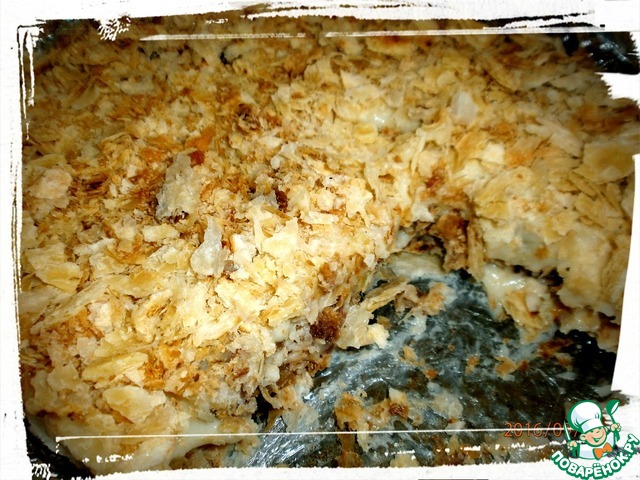 - Печенье (из слоеного теста "ушки" 400 г - для "коржей" и 100 г - для посыпки верха) — 500 г