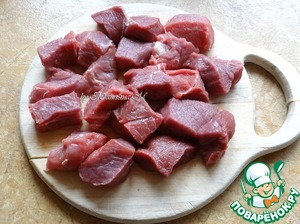 Грудинку (у меня сыровяленная свиная шея) порезать полосками, крупный лук - пополам, крупную морковь - кружочками или полукругами;