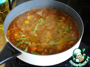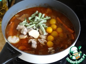 За 10 минут до готовности добавить резанные шампиньоны, фасоль и черри;