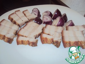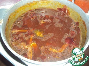 В кастрюлю 3 жмени луковой шелухи, 8 горошин черного перца, 3 горошинки душистого перца, 200 гр соли, 2 лавровых листа. Заливаем водой примерно 3 литра. Доводим до кипения и закладываем почеревок нарезанный удобными для вас кусками. Даем закипеть и варим 10 минут. Оставляем в кастрюле на 5 часов при комнатной температуре.
