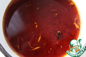 Я делала половину порции. Смешать ром, апельсиновый ликер и воду. Добавить сахарную пудру, ванильный сахар, апельсиновую цедру (можно использовать сухую апельсиновую корку длиной 4 см) и специи. Тщательно перемешать.