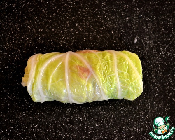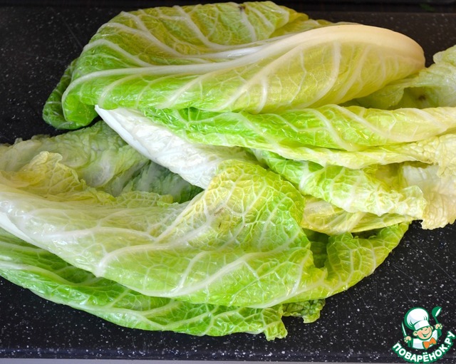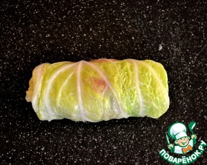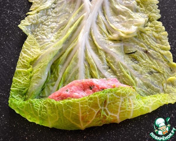 На листья капусты положить начинку. (Жёсткую часть основания листа можно слегка отбить кухонным молотком)