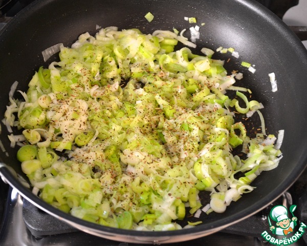 Поместить капустные листья в кастрюлю и залить кипятком, закрыть крышкой и варить 3 минуты на медленном огне. Осторожно достать листья и ополоснуть холодной водой. Дать стечь воде. Лук-порей промыть и нарезать полукольцами.