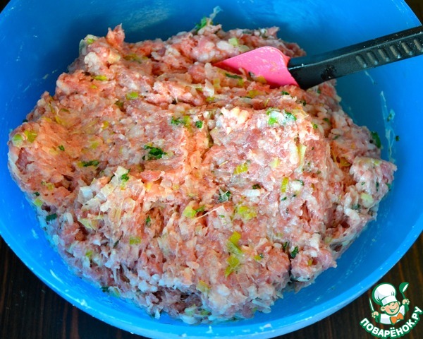 Смешать говяжий и бараний фарш, припущенный лук и зелень (петрушка, тархун).