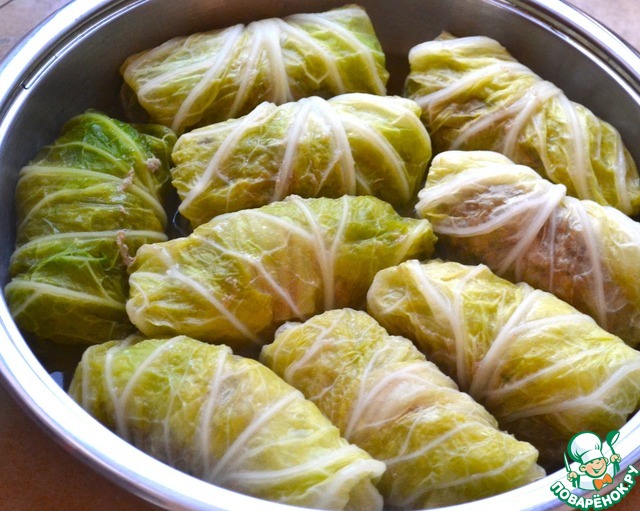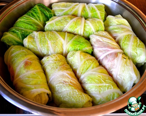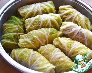 Уложить в теплоемкую кастрюлю с толстым дном, добавить теплой воды до середины уровня голубцов. Поставить на средний огонь, накрыть крышкой и довести до кипения, уменьшить огонь и варить 30 минут. (Если потребуется, подлить немного воды)