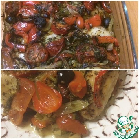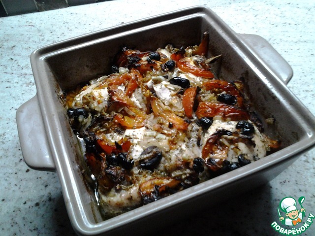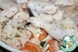 Выкладываем половину овощной смеси в глубокую форму для запекания. Сверху кладем куски курицы.