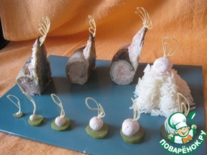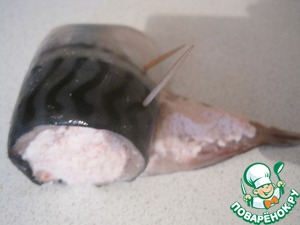 Кладем эту массу по всей длине филе, на место среза головы кладем еще чайную ложку крабовой массы.