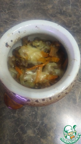 За 5 минут до готовности вынуть горшочки, посыпать тертым сыром и снова убрать в духовку (крышкой не закрывать, чтобы сыр успел подрумяниться).
