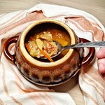 В горшочки слоями выложить немного мяса, затем овощи, снова мясо, овощи и т. д. Из данного количества ингредиентов у меня получилось 2 полных горшочка. Не бойтесь набивать горшочки дополна, так как в процессе приготовления овощи упарятся, и получится горшочек, заполненный на 2/3. Залить бульоном на 2/3 горшочка, накрыть крышкой. Духовку разогреть до 160 град. и готовить 1 час 30 минут.