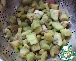 В кипящую воду добавить 2 ст. л. соли, забросить нарезанные баклажаны. Отваривать в течение 3-4 минут. Откинуть на дуршлаг.