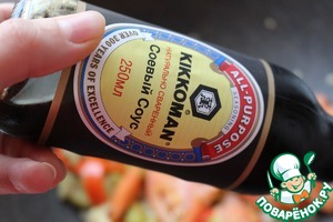 Добавить баклажан, курицу и помидор, приправить соевым соусом и прованскими травами.