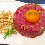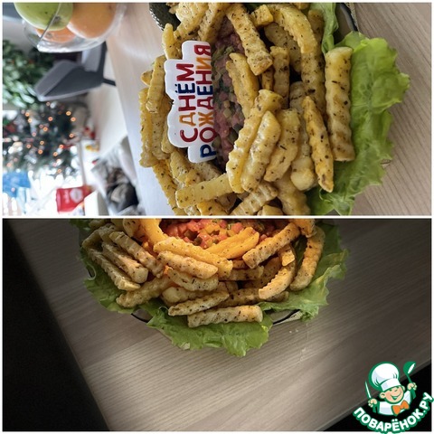 Подают тартар обычно с картофелем фри и зеленым листовым салатом. Желток и мясо перемешиваются.