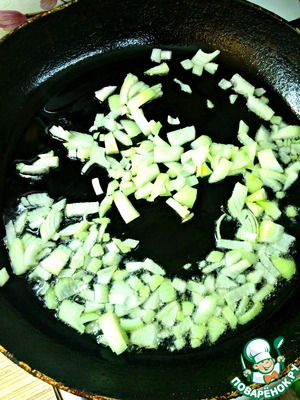 Лук нарезаем кубиком и обжариваем на разогретом оливковом масле пару минут, до мягкости.