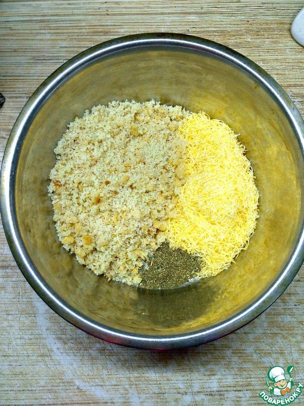 В это время в миске смешаем хлебные крошки, тертый на мелкой терке сыр и петрушку (можно использовать сухую).