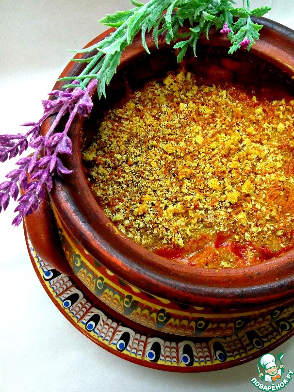 Посыпаем поверхность кассуле хлебной смесью и ставим в духовку без крышки еще на 20 минут.