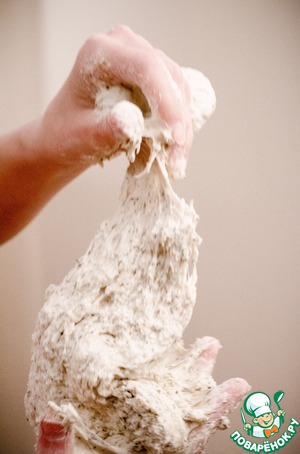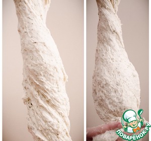 Вымешивайте тесто на рабочей поверхности (5-10 минут), стараясь при этом захватить в тесто как можно больше воздуха. Сформируйте из теста шар и уложите его в слегка присыпанную мукой миску. Накройте полотенцем и оставьте подходить в тёплом месте, подальше от сквозняков, на час.