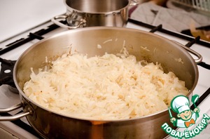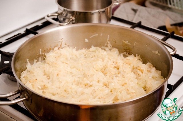 Весь лук, который Вы пожарили на 1 этапе нужно добавить в смесь: яйца-сливки-специи. А потом всю эту жидкую начинку Вы выкладываете на тесто.