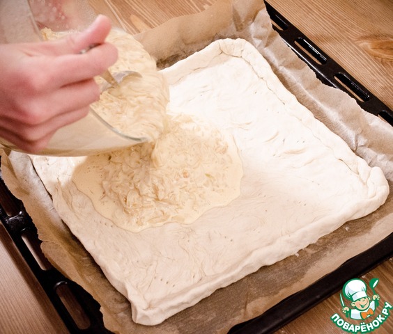 Распределите луковую начинку равномерно по всей поверхности теста.