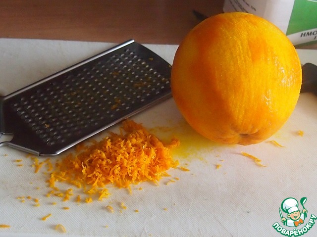 Крупный апельсин помыть, залить кипятком на несколько минут. Натереть цедру.