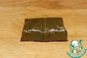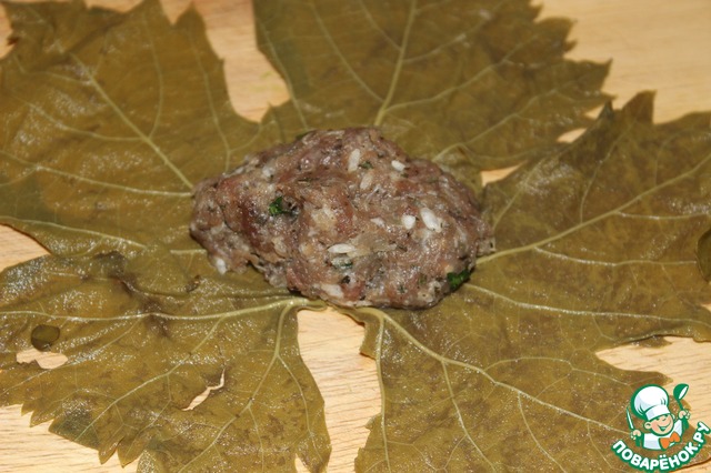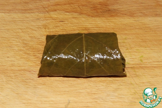 Фарш кладется на ребристую часть листьев, а сверху должна быть гладкая сторона листа. Хвостики у листика отрезаются.