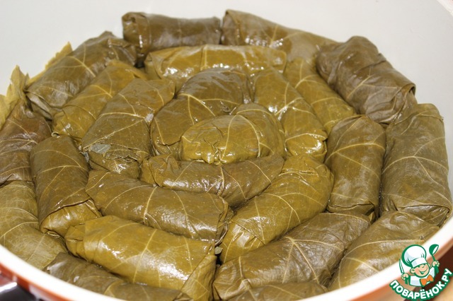 На дно кастрюли выложить виноградные листья, чтобы наша толма не пригорела. А уже потом выкладываем нашу толму в кастрюлю, по кругу плотно, швом вниз.