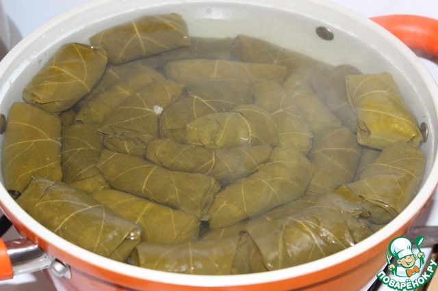 Толму заливаем кипятком, чтобы уровень воды был выше толмы см на 10 и кладёт на них тарелку с грузом, чтобы листики не развернулись. Если налить мало воды, то рис все впитает и толма будет сухая, может даже подгореть.