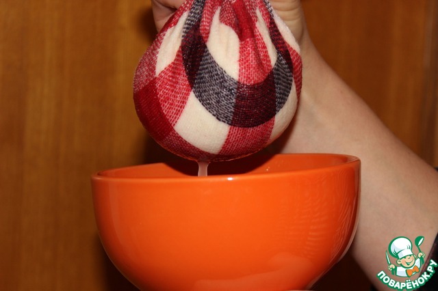 Готовим соус. Мацони для толмы предварительно подготавливаем: берём мацони, кладём в льняной или х/б мешочек и подвешиваем на несколько часов, чтобы стекла жидкость, и уже это мацони используем для толмы.