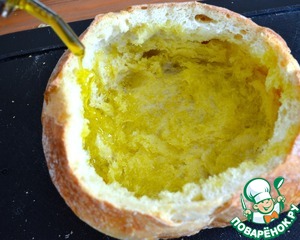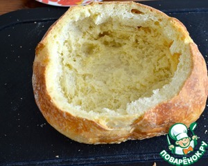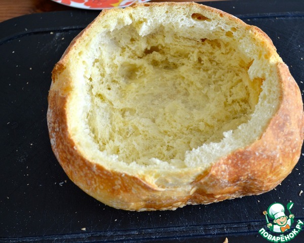 • Выньте весь мякиш, чтобы осталась основа-форма из хлебной корки. Из хлебного мякиша можно приготовить домашние сухарики или панировочную крошку...