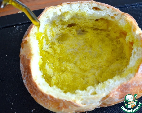 • Внутри промажьте хлеб обильно оливковым маслом.
