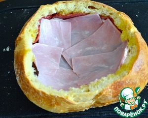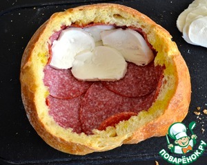 • Выложите дно и стенки хлеба изнутри салями в один слой. Сверху уложите тонко нарезанную моцареллу... Слегка сбрызните оливковым маслом, посолите и поперчите.
