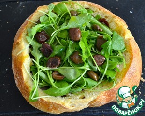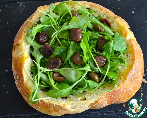 • Заполните оставшееся пространство вымытыми и высушенными листьями салата руккола. Снова сбрызните маслом и посолите, поперчите (по желанию). Разложите оливки. В конце можно добавить нарезанный тонкими кружочками свежий помидор (удалив мякоть с семенами) и порвать листики базилика.