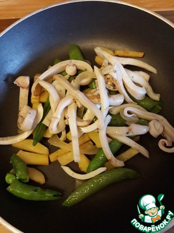 • Тем временем отварите кальмаров и нарежьте их соломкой, добавьте к овощам на сковороде, хорошо прогейте