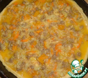Тесто достать из холодильника, раскатать в пласт и поместить в сковороду. Выкладываем начинку. Сверху посыпать сыром.