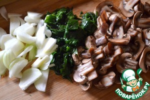 Отвариваем шампиньоны, нарезаем их вдоль. Нарезаем шпинат и лук.