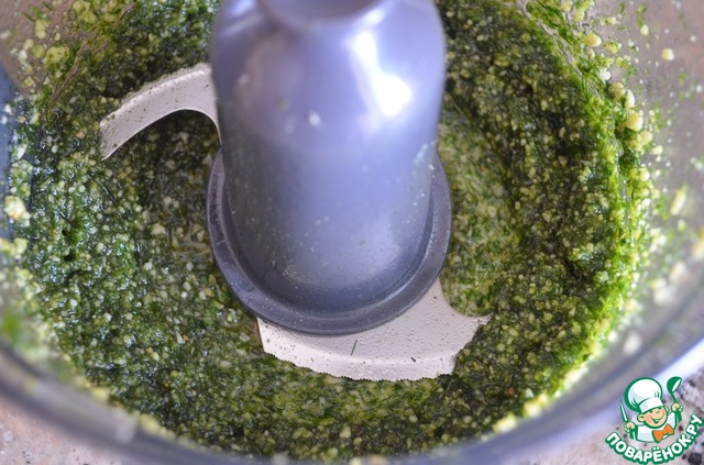 Затем положить готовый миндаль и остальные ингредиенты кроме масла в комбайн и прокрутить для получения достаточно густого песто.
