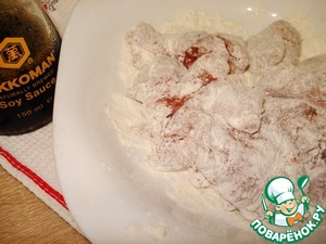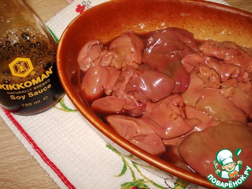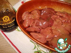 Куриную печень промыть, нарезать на кусочки залить небольшим количеством соевого соуса от ТМ Kikkoman и оставить мариноваться.