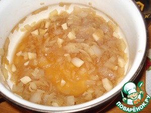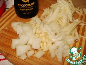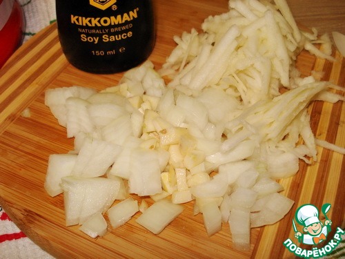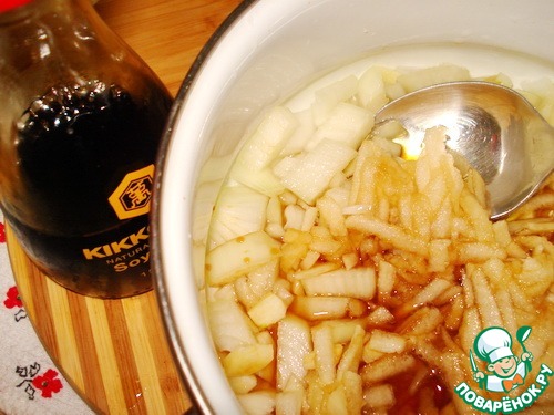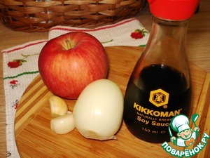 В сотейник наливаем 100 мл воды, добавляем 2 ст. ложки соевого соуса от ТМ Kikkoman, яблоко, лук репчатый, чеснок.