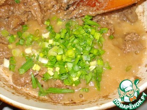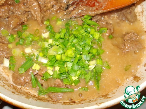 Потом нарезанный зеленый лук. Перемешиваем и прогреваем одну минуту.