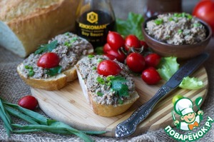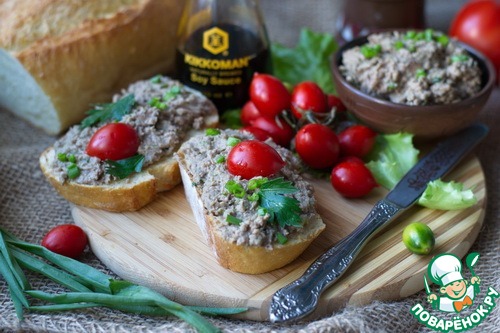 Паштет подавать теплым на кусочке хлеба с зеленью и овощами.