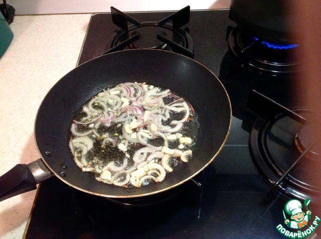 Сначала режем лук полукольцами и чеснок (если зубчик крупный, то хватит половины)небольшими кусочками и пассируем на оливковом масле -