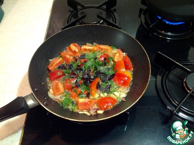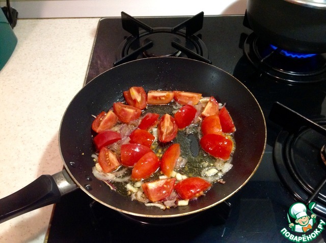 Добавляем к луку помидорки, если у вас мелкие Черри, то режьте пополам, если крупные -на четыре части, перемешиваем и немного обжариваем