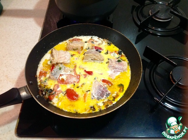 Перемешали, немного на огне подержали и добавляем лосось, жидкость в которой он лежал не нужна, куски должны быть крупные