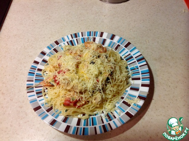 Пока готовили соус, сварились спагетти, это очень важный момент, нужны вкусные макароны, мне нравится Pasta Zara (1) или Barilla. Время варки указано на пачке и я его никогда не увеличиваю, ну и конечно спагетти нельзя промывать, сварили, откинули в дуршлаг, вода слилась и на тарелку, сверху соус и по-желанию тёртый сыр