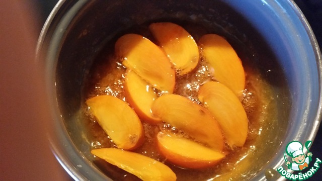 Начинаем готовить начинку. Всыпаем сахар в сотейник и ставим на плиту. Пока сахар станет светло коричневым, готовим хурму. Нарезаем дольками. Хурма не должна быть переспевшей и мягкой. Как сахар стал коричневым, снимаем с огня, добавляем воду и опускаем туда хурму. Ставим на плиту и аккуратно переворачиваем хурму, чтоб она полностью покрылась карамелью. Вынимаем хурму и добавляем сливки и ваниль. Перемешиваем. Все должно остыть. Желтки (только желтки )перемешиваем и добавляем в заливку.
