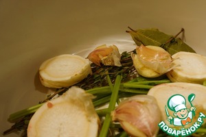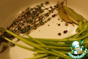 На дно жаропрочной посудины (у меня керамическая кастрюля для духовки) кладем тимьян, «хвосты» от петрушки, лавровый лист, перец горошком.