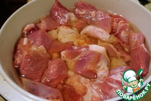 Мясо нужно порезать кусочками около 5 см, ребрышки я порезала на кусочки по 1 ребру на каждый. -
