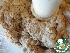 Когда дрожжи начнут действовать, смешиваем их с мукой с солью. Вымешиваем и постепенно добавляем остальную воду.