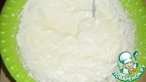 Ставим будущий торт в духовку и занимаемся кремом. Сливки взбиваем до пышной воздушной массы, добавляем 2 ст. л. сгущенного молока, чтобы крем был сладким и продолжаем взбивать до однородности. Крем готов.