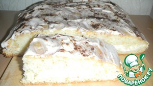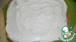 Бисквит вынимаем из духовки, остужаем и разрезаем вдоль на 2 части. На середину и верх торта обильно наносим крем.