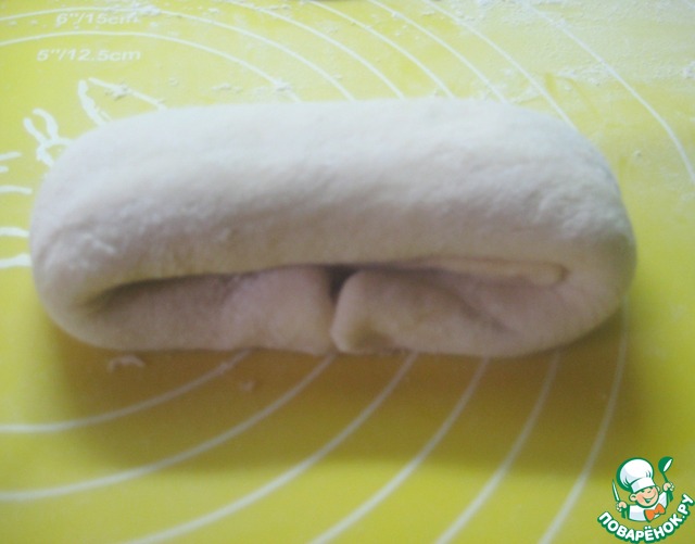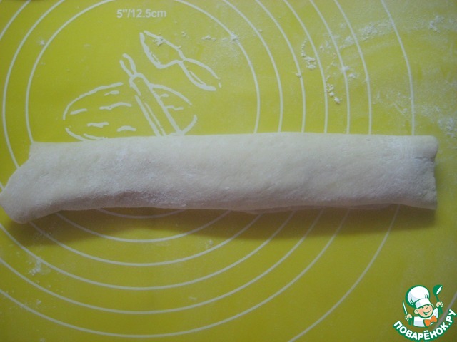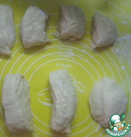 Рабочую поверхность припыляем мукой. Делим тесто на 12 частей.